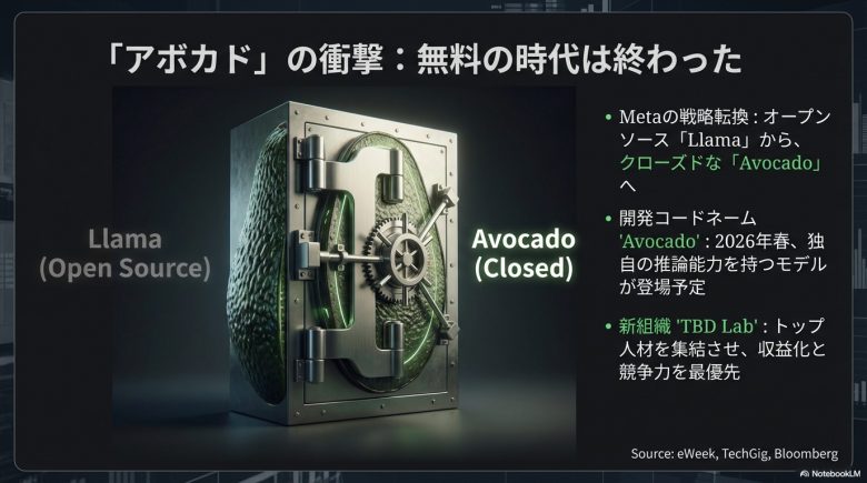 Metaの次世代モデルのコードネームとされる「Avocado」が象徴するように、これからの高性能AIは「クローズドで有料」になります。