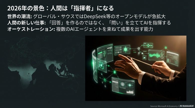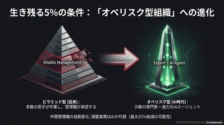 - 中間層の消滅: 情報の伝達・調整・承認といった「中間管理職」の仕事は、AIエージェントが瞬時に行います。